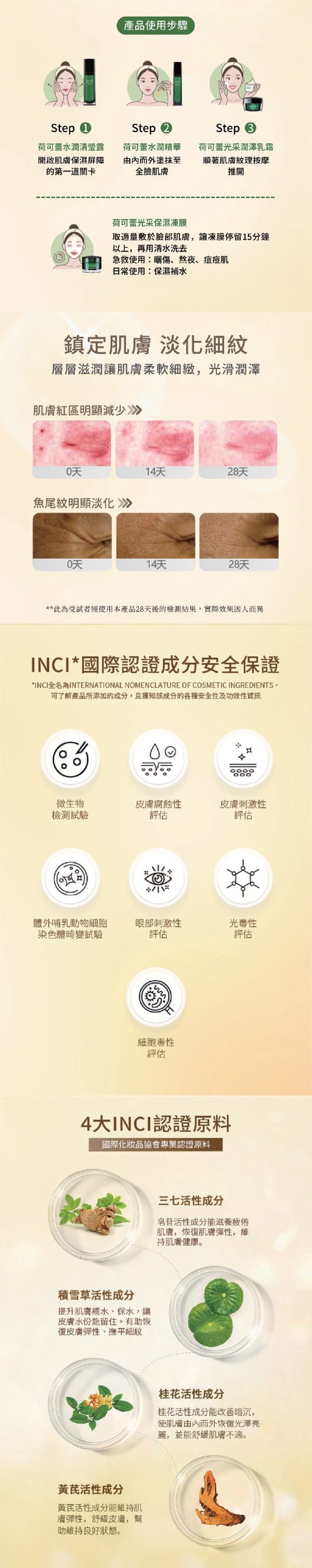 重點成分 : 黃芪提取物、桂花提取物、三七根提取物、積雪草提取物