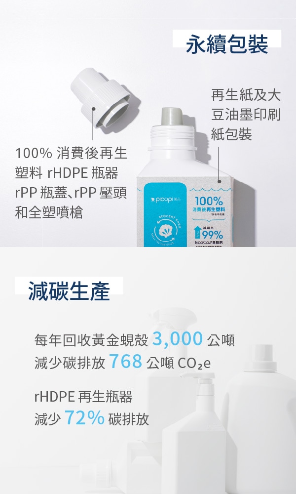 材質:100%消費後再生塑料rPET瓶身,再生紙大豆油墨印刷盒子